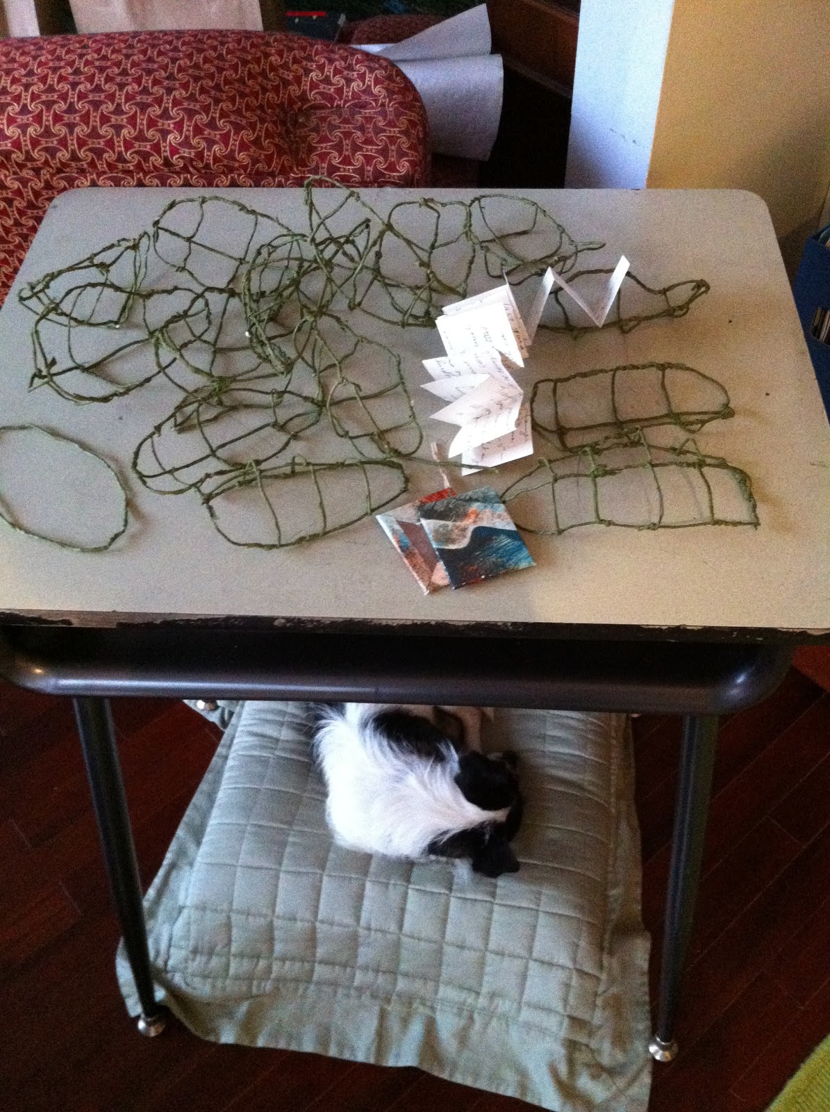 I've been pondering and avoiding the "Rowing Boat" Book Art Object project for months now caught up on the boat structure. I know I'm missing something obvious, but after trolling for boat making directions--- finding cute ones for real row boats and origami instructions for boat-like structures--- and making clumsy clay and foam core structures, I've determined to follow my attraction to the abstract notion of a vessel. This decision is based on the stash of floral wire and wrap I found in a drawer and the lessening of frustration experienced while making these. On the spiritual front, it is pleasurably meaningful to shape them between the palms of my hands.